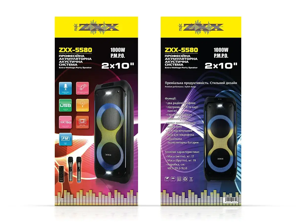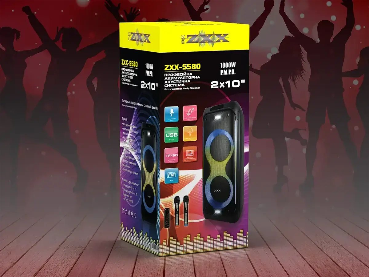 Акустична переносна колонка ZXX-5580 80Вт 2x10" USB/TF/FM/BT/TWS/2MIC/ДК/ 6298