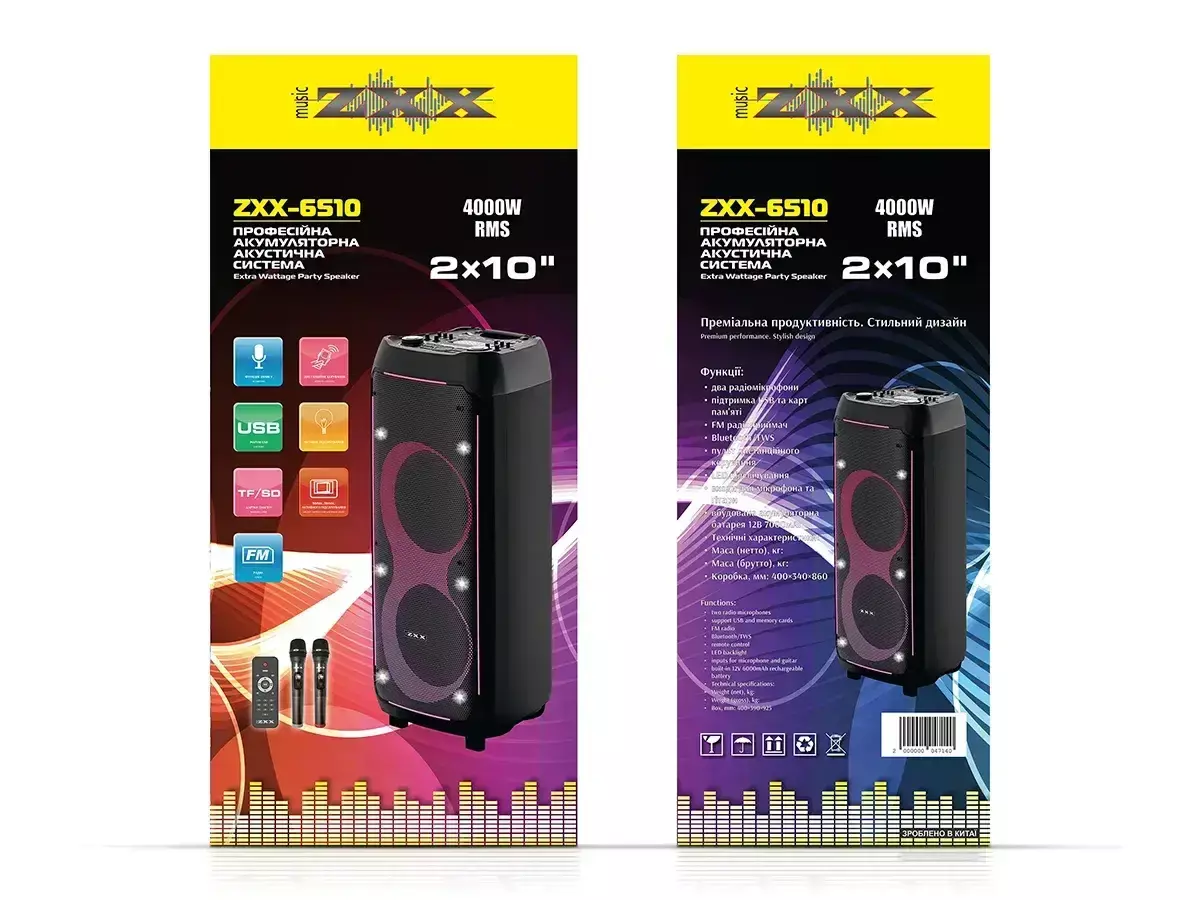Акустична переносна колонка ZXX-6510 100Вт 2x10" TWS/FM/USB/TF/BT/REC/LED/2MIC/ДК/ 6291