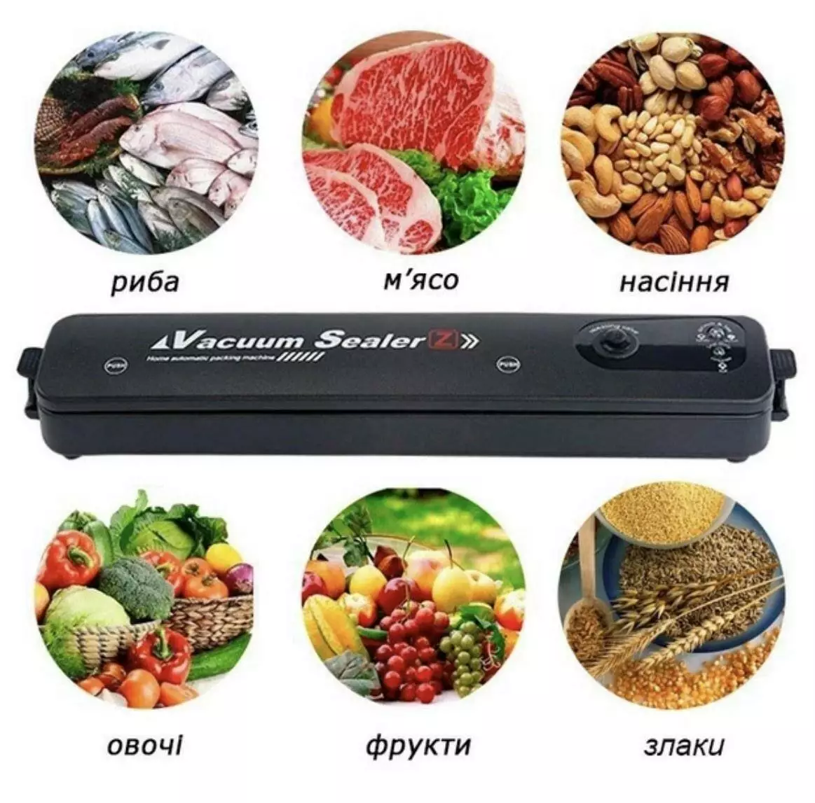 Вакуумна герметизація з машинкою Vacuum Sealer - за лічені секунди одним натисканням кнопки. Легкий та компактний дизайн роблять пакувальник простим у використанні на кухні будь-яких розмірів.