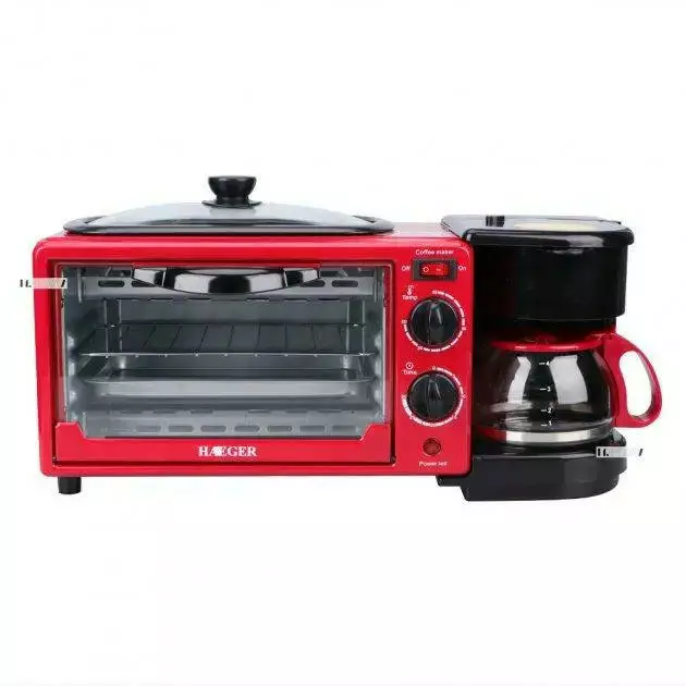 Электрическая печь настольная для для кухни для выпечки с кофеваркой и сковородой 3в1 (машина для завтрака) RAF 1250Вт Красная (HG-5308) - это удивительный маленький многофункциональный кухонный прибор, который может приготовить до 6 чашек кофе, тосты, выпекать, жарить или разогревать продукты и даже использоваться для приготовления на сковороде!