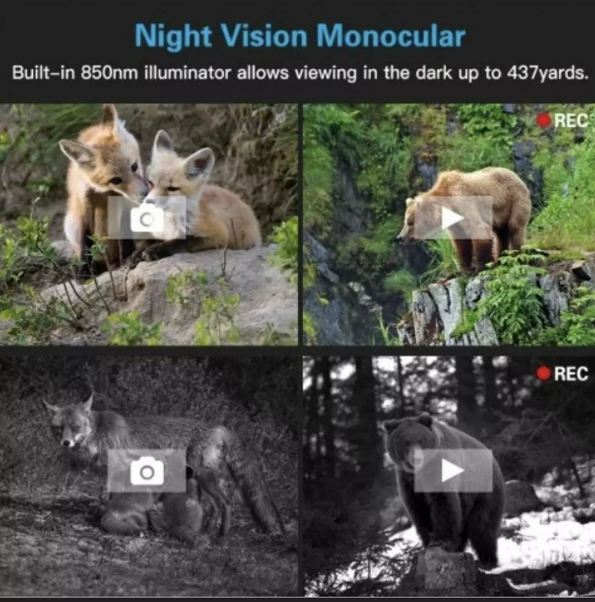 Бінокль здійснює запис відео та зйомку фото з роздільною здатністю 640х480 пікселів. Запис звуку відсутній. Для зберігання запису служить картка пам'яті до 32 Гб. Усі налаштування виконуються через вбудоване меню.