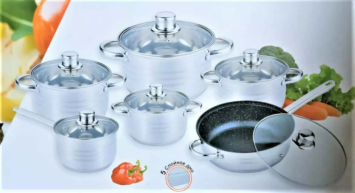 BN-290 (2)-Набір каструль 12 пр Нерж 2,1л; 2,1л; 2,9л; 3,9л; 6,5 л + сковорода