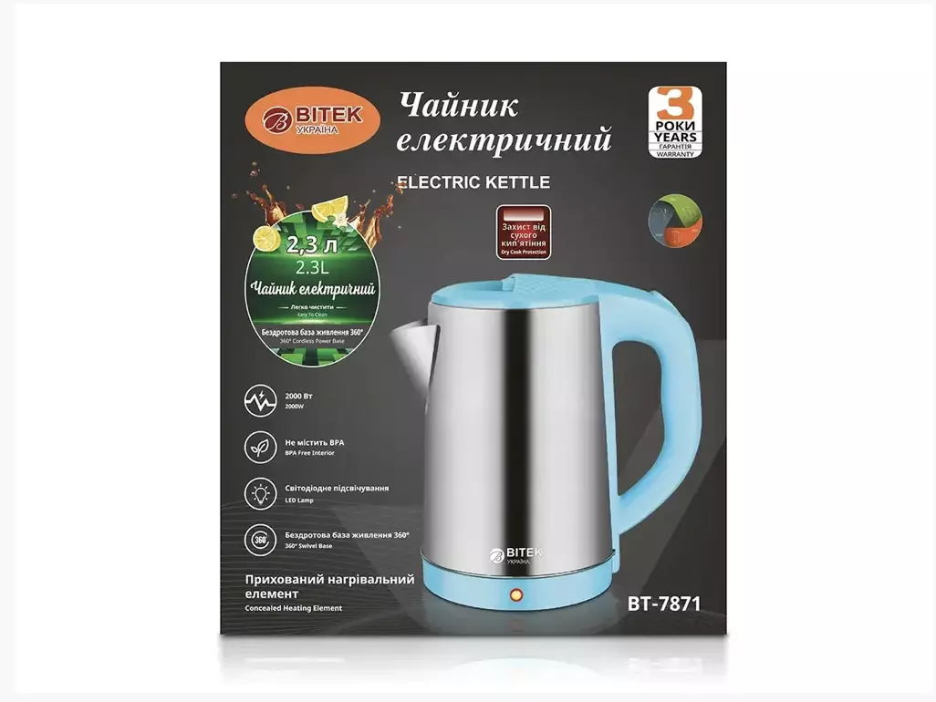 Чайник електричний з нержавіючої сталі 2,3л 2000Вт BITEK BT-7883/