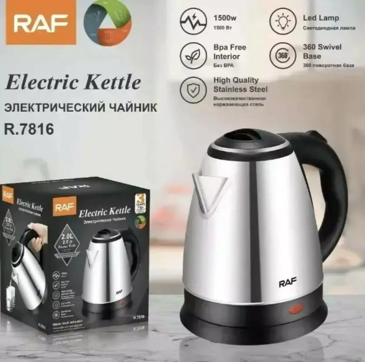 Електрочайник RAF 7816 відрізняється збільшеним об'ємом - 2 літри.