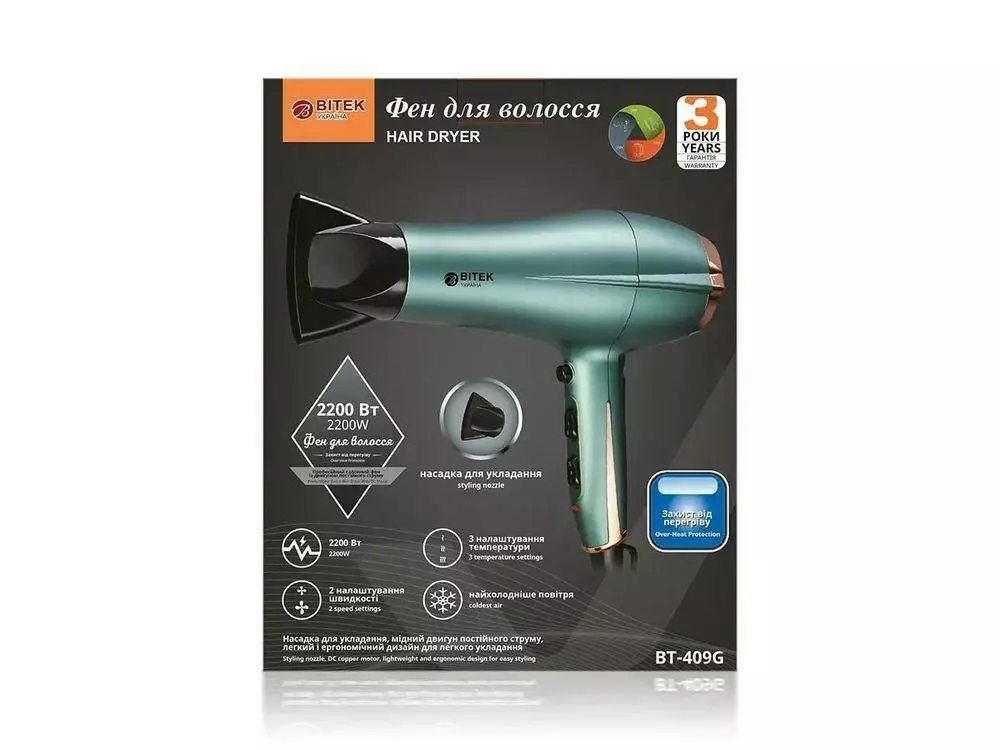 Фен для волосся 2200 Вт BITEK BT-409G 7117 (12 шт.)
