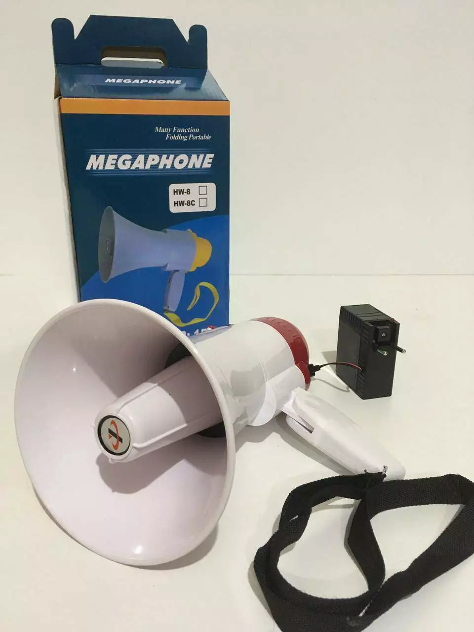 Рупор Мегафон HW-8C ― акумуляторний гучномовець потужністю 10 Вт. Працює від акумулятора або елементів живлення типу D. Радіус дії рупору – до 500 метрів. Діаметр ― 155 мм.