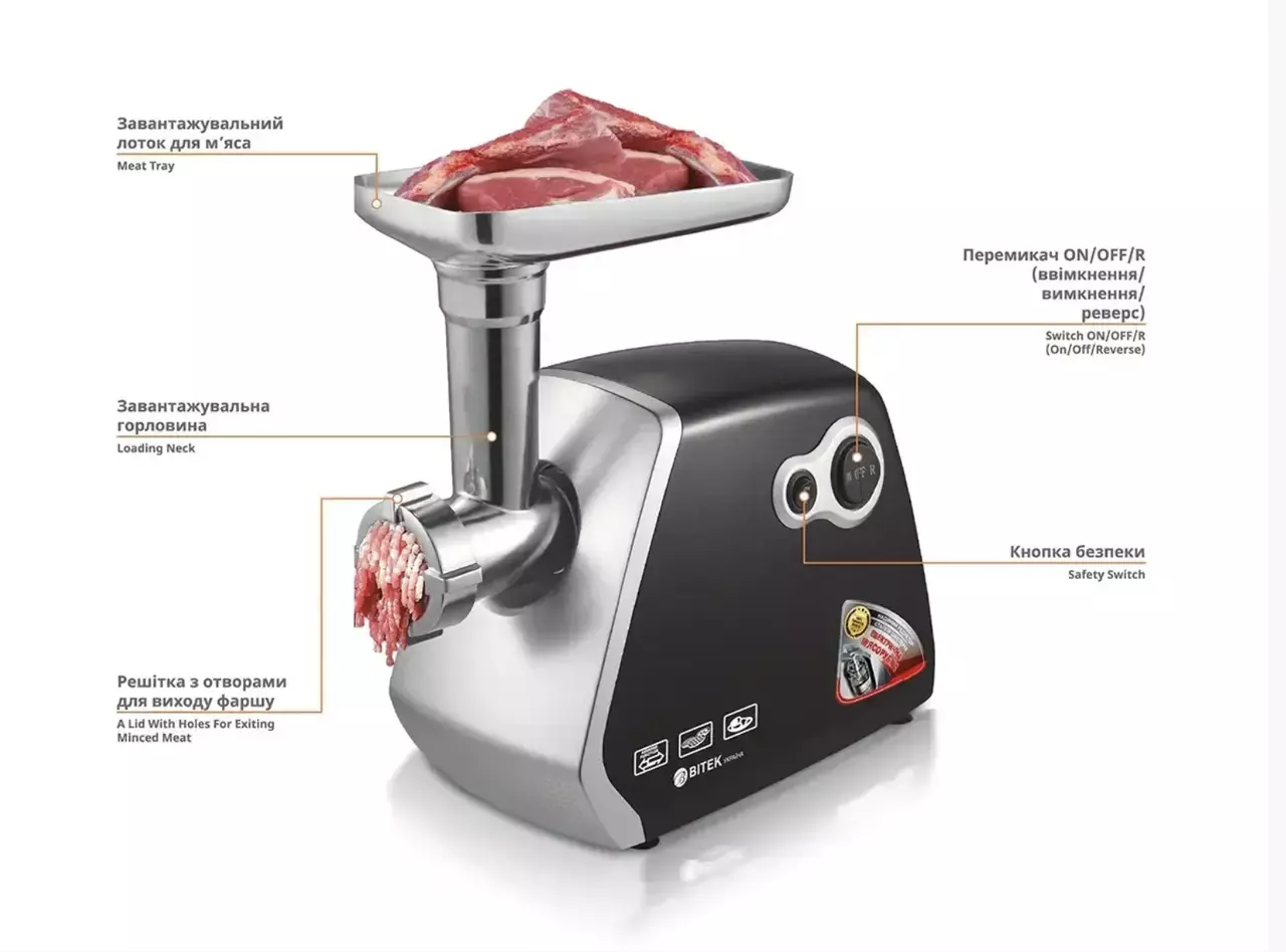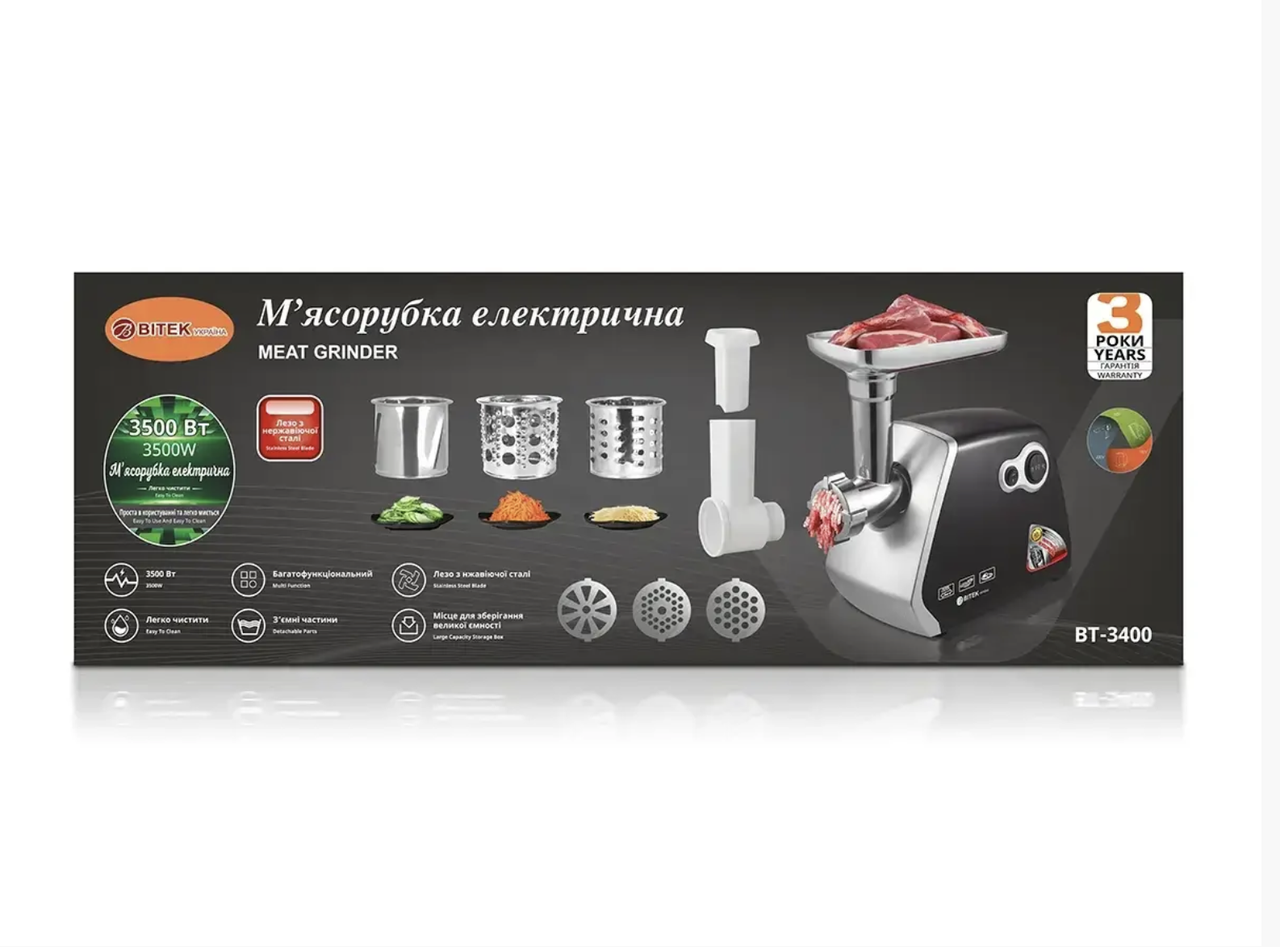 М'ясорубка електрична метал.корпус 3500Вт ковбаса кеббе насадки BITEK BT-3400/ 6814 (4)