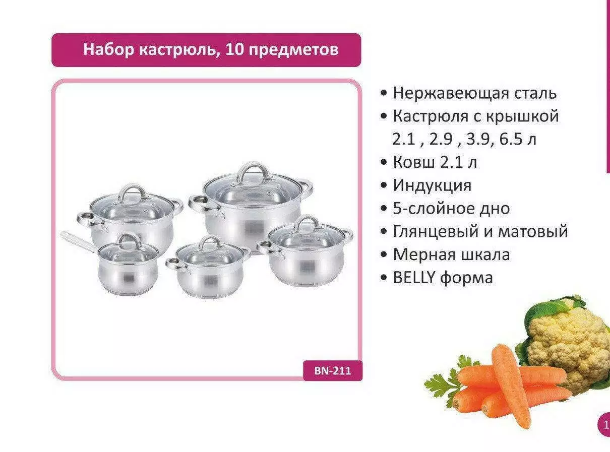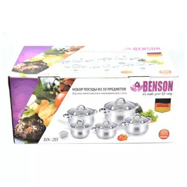 Набір каструль 10 пр. Нерж 2,1л; 2,1л; 2,9л; 3,9л; 6,5 л BN 211 (2