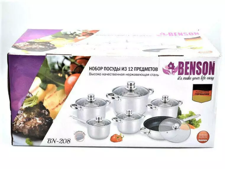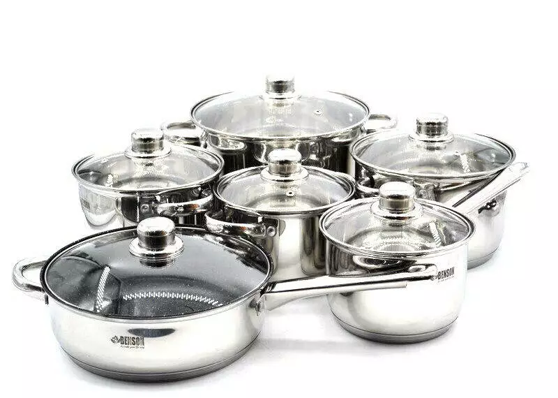 Набір каструль 12 пр Нерж 2,1л; 2,1л; 2,9л; 3,9л; 6,5 л +сковорода 24 см BN-208 (2 шт./яск.)