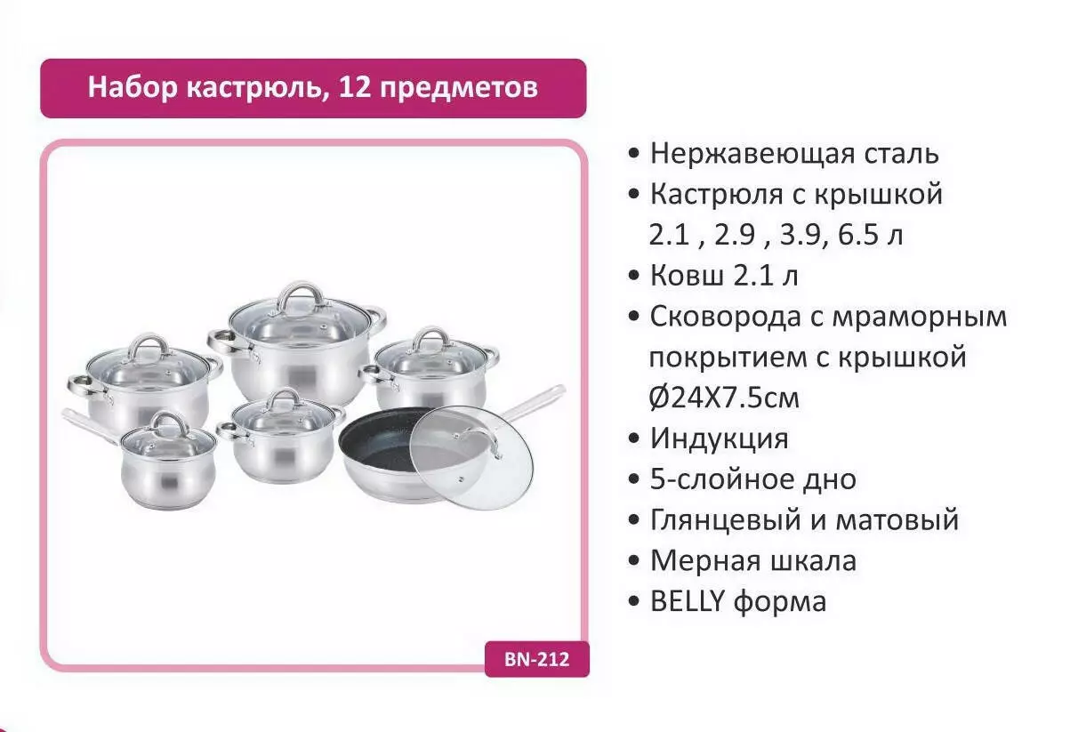 Набір каструль 12 пр. Нерж 2,1л; 2,1л; 2,9л; 3,9л; 6,5 л +сковорода 24 см BN 212 (2 шт./яск.)