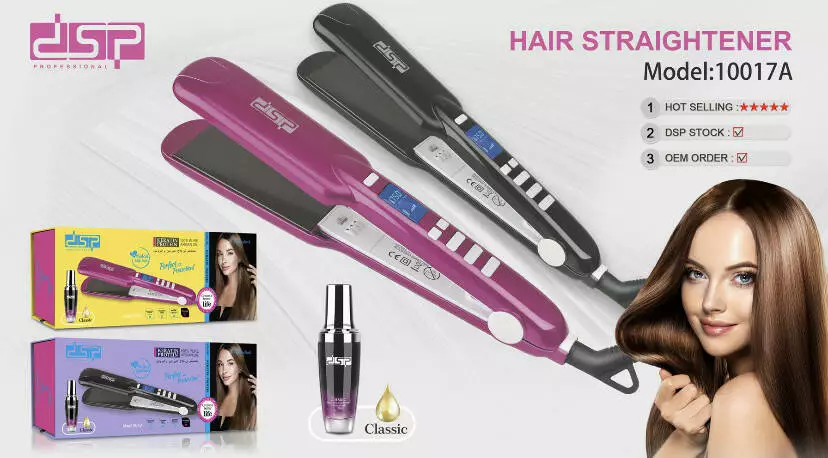 Праска DSP — 10017 обладнана регульованим температурним контролем до 400 o C. На корпусі розташовані кнопки healthy — для здорового волосся, damaged — для пошкоджених, увімкнення/вимкнення, блокування і збільшення/зменшення температури.