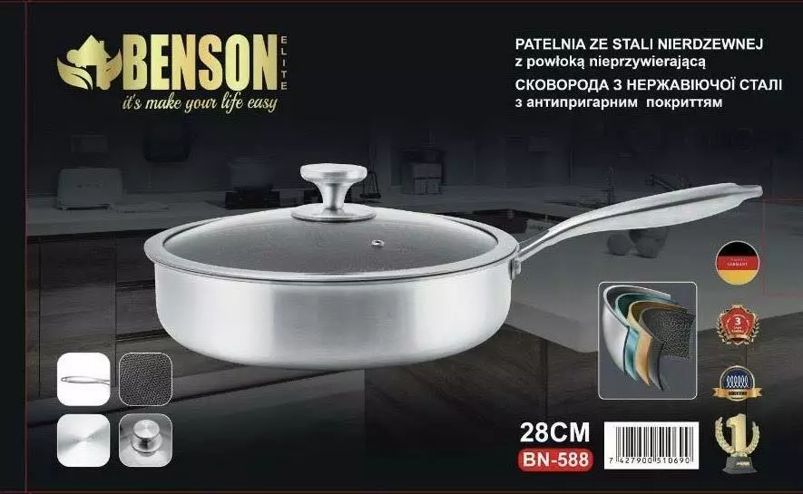 Сковорода глибока 28 см із неіржавкої сталі професійна Антиприг BN-588 (6 шт./ящ)