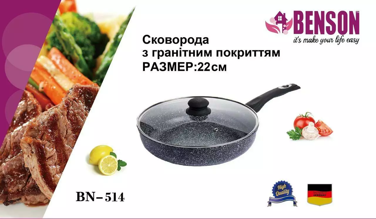 Сковорода з кришкою22 см гранітне покр. світле BN 514 (12 шт./ясть)