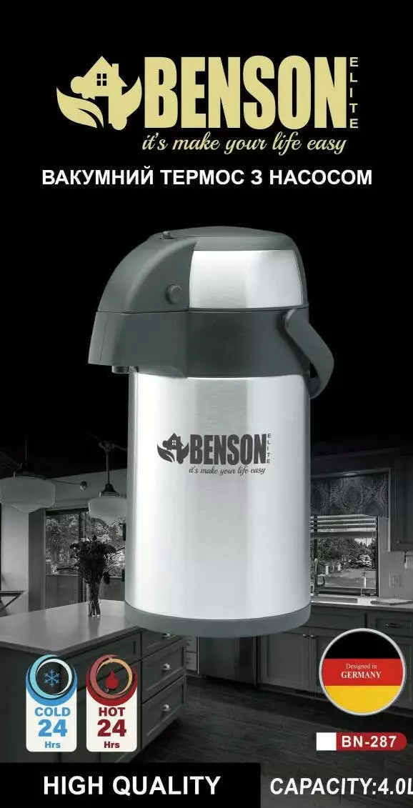 Ідеальне пристосування для зберігання гарячих або холодних напоїв. Термос із насосом Benson BN-287 виготовлений із високоякісної неіржавкої сталі. Легко миється, не боїться різких перепадів температури та нагрівання. Вміє великий діаметр, що дає змогу легко заливати воду або класти шматочки льоду. Кришка з пластику обладнана пневмонасосом і силіконовими ущільнювачами, що дає змогу добре та щільно прилягати до горловини термоса, чудово зберігаючи температуру всередині. Також є кнопка для блокування Пневмонасоса. На кришці розташована рухома ручка, завдяки якій легко та зручно переносити термос