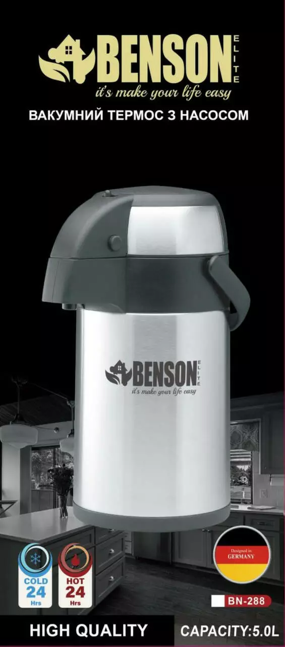 Ідеальне пристосування для зберігання гарячих або холодних напоїв. Термос із насосом Benson BN-287 виготовлений із високоякісної неіржавкої сталі. Легко миється, не боїться різких перепадів температури та нагрівання. Вміє великий діаметр, що дає змогу легко заливати воду або класти шматочки льоду. Кришка з пластику обладнана пневмонасосом і силіконовими ущільнювачами, що дає змогу добре та щільно прилягати до горловини термоса, чудово зберігаючи температуру всередині. Також є кнопка для блокування Пневмонасоса. На кришці розташована рухома ручка, завдяки якій легко та зручно переносити термос