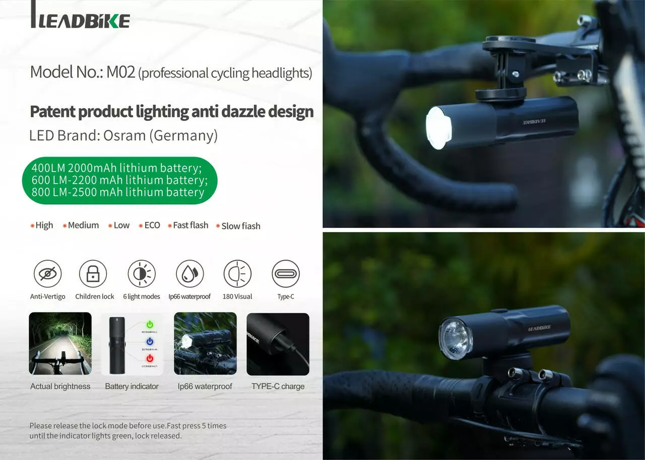 Велофара потужна LEADBIKE M02-OSRAM 400LM, 2000 mAh,waterproof, children lock, ЗП Type-C (100)