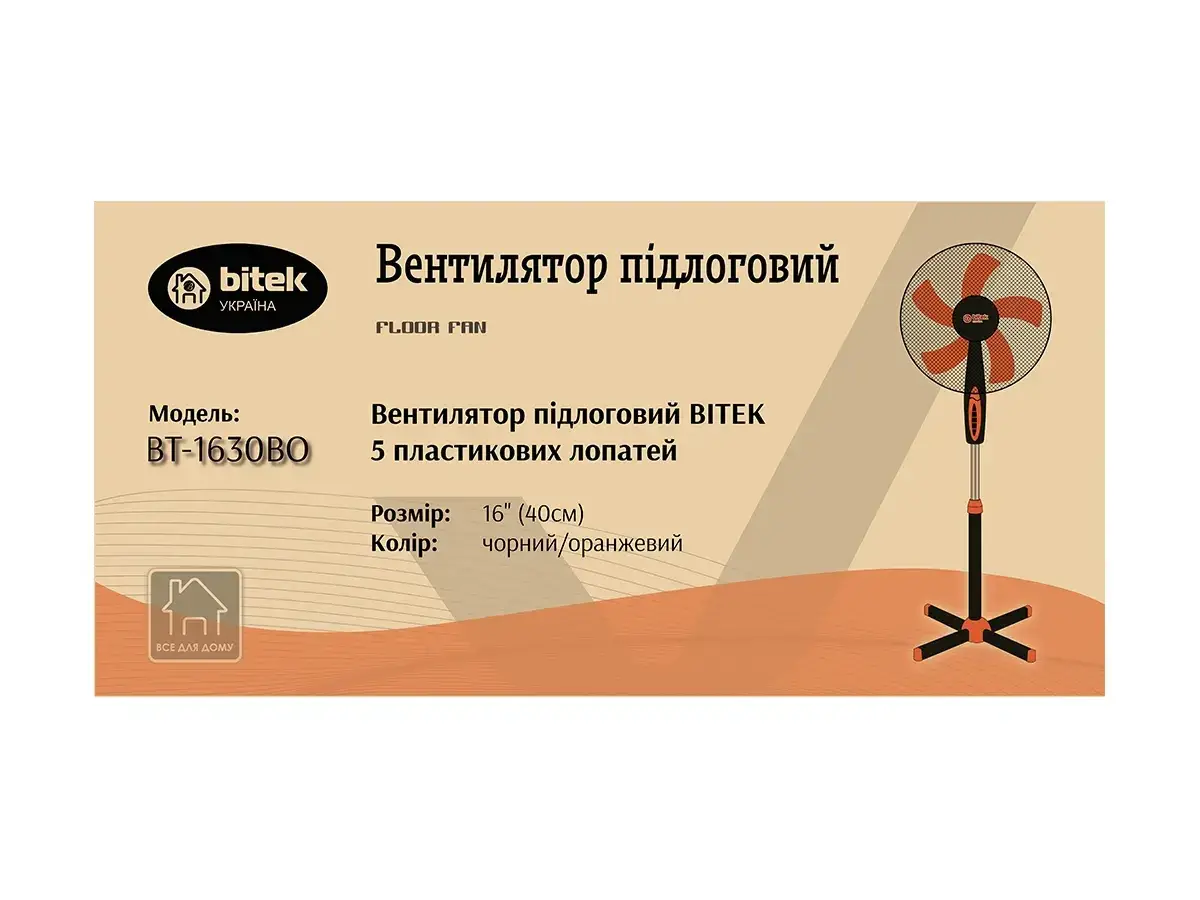 Вентилятор підлоговий BITEK 16" (40см) 100Вт 5 пласт. лоп. чорний/оранжевий BT-1630BO, 8088 (4)