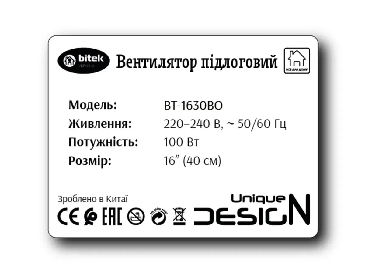 Вентилятор підлоговий BITEK 16" (40см) 100Вт 5 пласт. лоп.